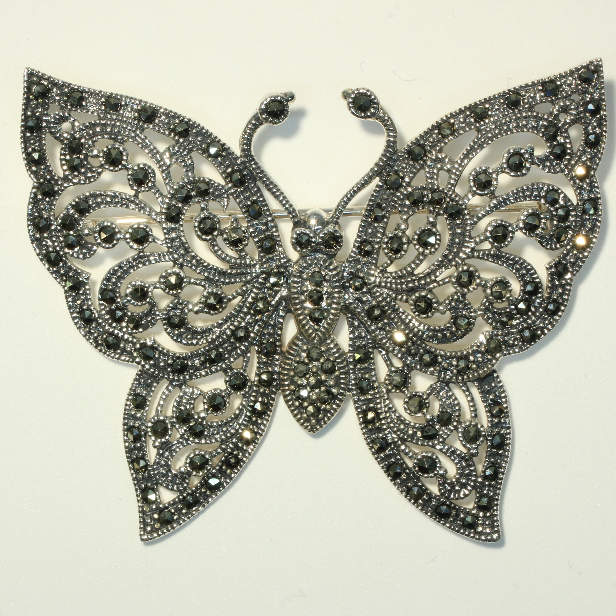 Sterling Silver large (2.5-inch x 2.25-inch) Butterfly form with pierced lacewing detailing with milgrain details and set liberally with Markasite accents. This beautiful creature is sure to soar in it's beautiful design!